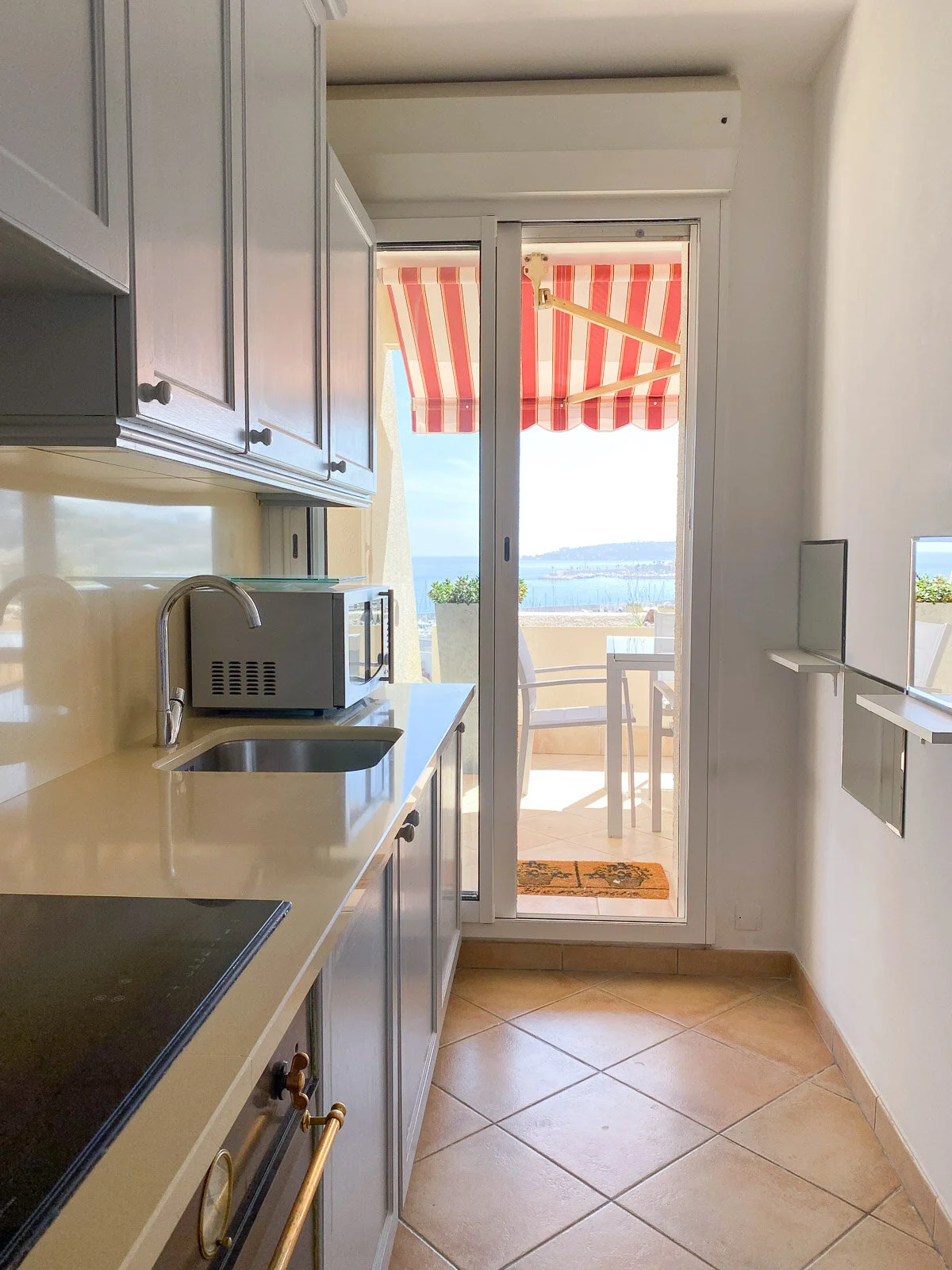 Large bay windows allow light to gently caress two 5-star king size beds. The 45 m2 interior suite is equipped with a spacious dressing room, a large living room, a superb bathroom and a beautiful fully equipped kitchen, with dishwasher and washing machine with a breathtaking view of the waves blues of the Mediterranean.